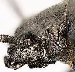 Der Kopf ist flach und breit, er verjüngt sich in Aufsicht nach vorn grob trapezförmig. Die Basis des Kopfes ist halsförmig abgeschnürt und in den Halsschild zurückgezogen. Der Kopf ist etwas breiter als lang und dicht punktiert (Abb. 5 links C). Der Kopfschild ist vorn leicht konkav. Die Augen (Abb. 2) sind dreimal so breit wie lang, kaum gewölbt und leicht nierenförmig. Die elfgliedrigen Fühler (Abb. 7) sind so lang wie der Halsschild, schnurförmig und gegen die Spitze nur wenig dicker werdend, das dritte Glied ist deutlich das längste, länger als das vierte und fünfte zusammen, die Glieder vier bis sieben sind trapezförmig, die drei vorletzten Glieder rundlich bis linsenförmig und durch eine bräunliche Pubeszens wie das Endglied matt, letzteres etwas schmaler, etwa so lang wie breit und zugespitzt endend. Die Einlenkung der Fühler ist nach oben durch eine Erweiterung der Wangen verdeckt (Abb. 2, Abb. 7). Die Oberlippe ist breiter als lang und vorn leicht ausgerandet. Das Kinn (in Abb. 4 C rot) verschmälert sich zur Basis so, dass die Einlenkung der Unterkiefer sichtbar ist. Die Unterkiefer (in Abb. 4 C hellblau) tragen an der Spitze der Innenlade einen nach innen gerichteten zweispitzigen Hornhaken (Abb. 4 D). Der Oberkiefer endet doppelspitzig (Abb. 4 A). Die Unterlippe (in Abb. 4 C hellgrün) ist zweilappig und herzförmig, die Lippentaster (in Abb. 4 C dunkelgrün) dreigliedrig mit beilförmigem Endglied. Die Kiefertaster (in Abb. 4 C dunkelblau) sind viergliedrig, das beilförmige Endglied gekrümmt und abgestutzt.