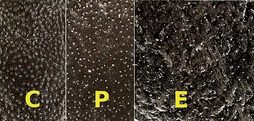 | Abb. 5: Punktierung der verschiedenen Körperabschnitte (gleicher Maßstab); C: auf dem Kopf, P: dem Halsschild E: den Flügeldecken | |||||||||