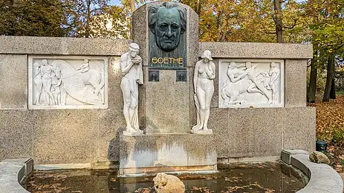 Das Denkmal besteht im Hintergrund aus einer vier Meter hohen und acht Meter breiten Wand, Mittelrisalit und zwei Flügel, verkleidet mit Granitplatten, passend zur Brunnenstadt in Form einer Brunnenanlage, „die das Dichterdenkmal fast vollständig in poetisch empfundene Jugendstilsymbolik und -ornamentik auflöste.“[9] Im Vordergrund heben sich ab: im Zentrum die Bronzeplastik Goethes in vierfacher Lebensgröße, unterhalb des Kopfs zwei bronzene Wasserspeier, rechts und links davon symmetrisch zwei Marmorreliefs und zwei Marmorfiguren in Lebensgröße; links schaut die männliche Figur in eine Schale, sie symbolisiert die Wahrheit, rechts schaut die weibliche Figur nach unten, sie symbolisiert die Schönheit; beide und im Zentrum Goethe, „ein guter Mensch“[10], symbolisieren die klassische Leitformel für Kunst und Bildung, die goethesche Trias „des Wahren, Guten, Schönen“.[11]