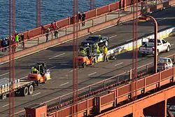 - ↑ a b c Golden Gate Bridge closing to install new collision barrier. In: cbsnews.com. 9. Januar 2015, abgerufen am 24. Mai 2023 (amerikanisches Englisch).