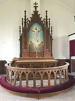 Das Gebäude besteht aus einem einfachen Rahmenbau. Der kleine zweigeschossige Kirchturm im Osten bildet auch den Eingang. Eine Treppe führt zum Eingang hinauf. Daneben befindet sich ein „Outhouse“ (Schuppen). Das Kirchenschiff ist einfach. Der Altar mit norwegischen Schnitzereien zeigt eine Himmelfahrtsszene. Die Abendmahlsschranken sind aus dem gleichen Holz gefertigt wie der Altar.[1]