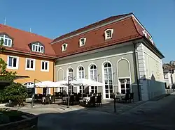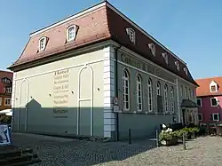 Der stattliche, unter Denkmalschutz[2] stehende Putzbau aus dem späten 18. Jahrhundert steht mit seiner Längsseite in der Flucht der Giebelfronten der Bauernhäuser auf der Südseite des Angers Altkötzschenbroda. Der zweigeschossige Baukörper von 10 Fensterachsen Länge ist zweigeteilt: die rechten vier Achsen mit der Eingangstür auf der Linken sind zweigeschossig, während die linken sechs Achsen mit schmalen, hohen Rundbogenfenstern den „reich dekorierten“[3] Saalteil belichten, der sich über zwei Geschosse erstreckt. Beide Bauteile werden durch ein hohes Ziegel-Mansarddach mit fünf Dachgauben gedeckt.