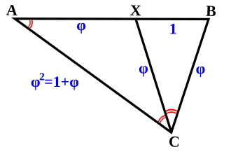 Auf der längsten Seite eines Goldenen Dreiecks trägt man, ggf. ausgehend von dem Eckpunkt mit dem kleineren Winkel, die kürzeste Seite ab und verbindet den so entstehenden Abtragungspunkt mit dem gegenüberliegenden Eckpunkt. Auf diese Weise wird in zwei Teildreiecke und zerlegt.