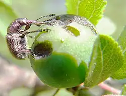 Bei Aprikosen verläuft wegen der Größe der Früchte die Entwicklung etwas anders als bei Kirschen. Der Rüssel des Weibchens ist trotz tiefen Eindringens viel zu kurz, um in die Nähe des Kerns zu gelangen. Die Eiablage erfolgt im Fruchtfleisch. Die Larve frisst Gänge durch das Fruchtfleisch, in den Kern kann sie nicht eindringen. Die Weibchen bevorzugen dabei von Monilia befallene Früchte und tragen durch die Fraßgänge zur weiteren Verbreitung der Pilzkrankheit bei.[11]