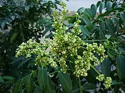 Die wechselständig an den Zweigen angeordneten, gestielten Laubblätter sind unpaarig gefiedert und sind 20 bis 60 Zentimeter lang. Der Blattstiel wird bis 15 Zentimeter lang. Die 9 bis 25, unterseits helleren und leicht glänzenden Fiederblättchen sind jeweils kurz gestielt, elliptisch oder eiförmig bis eilanzettlich, länglich und bei einer Breite von maximal 3,5–5 Zentimeter bis etwa 7,5–15 Zentimeter lang. Der verdickte Blattrand ist (entfernt-)gezähnt, -gesägt und leicht umgerollt. Die Spitze ist abgerundet oder spitz bis zugespitzt, die Nervatur ist gefiedert, mit teils verdickter und oberseits hellerer Mittelader. Zu Beginn der trocken-kühlen Jahreszeit fallen die Blätter ab, worauf nach einigen Wochen der Neuaustrieb einsetzt.