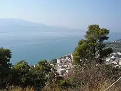 Der Golf von Korinth (griechisch Κορινθιακός Κόλπος, Korinthiakós Kólpos) ist eine langgestreckte Bucht des Ionischen Meeres zwischen Roumelien (Zentralgriechenland) im Norden und dem Peloponnes im Süden. Begrenzt wird er im Osten durch den Isthmus von Korinth und im Westen durch die zum Golf von Patras führende Meerenge von Rio-Andirrio (Στενό Ρίου-Αντίρριου), die seit 2004 von der Rio-Andirrio-Brücke überbrückt wird. Benannt ist er nach der wichtigen Hafen- und Handelsstadt Korinth. Seine Länge beträgt 127 Kilometer, seine Breite 8,4 bis 32 Kilometer und seine Tiefe bis 930 Meter.[1] Am Ende des Golfs von Korinth verbindet seit 1893 der Kanal von Korinth das Ionische Meer mit der Ägäis.