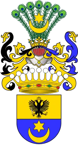 Das Wappen hat einen quergeteilten Schild; oben in Gold der kaiserliche Adler mit der Kaiserkrone, in der rechten Klaue Zepter und Schwert, in der linken den Reichsapfel, auf der Brust in Gold die Buchstaben J. II. Unten in Blau ein goldener mit Hörnern nach oben gekehrter Halbmond, über welchem ein goldener sechsstrahliger Stern schwebt (Wappengemeinschaft Leliwa). Den Schild deckt die Grafenkrone, über welcher sich ein gekrönter Helm erhebt. Dieser trägt einen Pfauenschweif von fünf Federn, welcher mit dem Halbmonde und dem Stern der unteren Schildhälfte belegt ist.