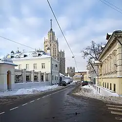 - Hausnummer 38 – Ein monumentalisches, vierzehnstöckiges Wohngebäude mit Kolonnade, Skulpturen und Bogen, auch im Stil des Stalinistischen Klassizismus. Architekt – N. Wischnewski und G. Worobjow. Das Gebäude wurde nach Plan der Rekonstruktion der Straße Gontscharnaja 1935 errichtet. Sein zentrales Korps wurde 1936–1939 errichtet für das Volkskommissariat für Verteidigung und wurde während des Kriegs durch deutsche Luftangriffe etwas beschädigt. Beide Flügel wurden von deutschen Kriegsgefangenen 1946 erbaut.[3][4]