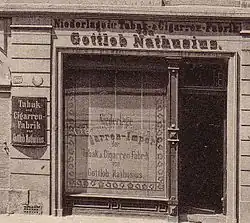 Am 1. Januar 1849 traten Hillebrand und Steinbrück aus der Firma aus, und Moritz Nathusius übernahm die Fabrik als Alleingesellschafter. Zu der bis dahin betriebenen Herstellung von Rauch-, Kau- und Schnupftabak wurde nun auch die Fabrikation von Zigarren aufgenommen. Die Zigarren-Produktion wurde weiter ausgebaut, vor allem als mit Gottlob August Nathusius (1849–1906),[15] der Sohn des Moritz Nathusius, am 1. Januar 1875 in nunmehr dritter Generation als Teilhaber in die Firma aufgenommen wurde.