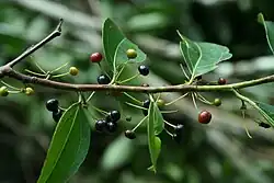 Es werden kleine, kahle und mehrsamige, anfänglich gelbe, dann rote und zur Reife schwärzliche, 4–6 Millimeter große, rundliche, gekammerte Steinfrüchte mit beständigem Kelch und fester Schale gebildet. Die gelb-braunen, 2–5 Samen (Pyrene) sind bis 1,5 Millimeter groß.