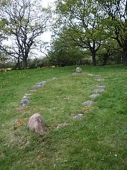 In den 1970er Jahren wurden einige Gräber und Teile zweier rechteckiger Wallanlagen untersucht. Unter einer wurde eine Schiffssetzung mit niedrigen Relingsteinen und hohen Bug- und Hecksteinen gefunden, wie sie auch auf Öland (Karums alvar – "Noaks Ark") vorkommt und auf Bornholm häufig ist. Zwischen zwei Steinen der Reling fand man eine kleine Steinkiste, die eine Urne mit verbrannten Knochen aus der späten Bronzezeit enthielt. Der Hügel aus Erde und Stein wurde in der späten Eisenzeit für Begräbnisse verwendet.