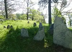 Auf dem Gräberfeld liegt eine der größten erhaltenen Schiffssetzungen Östergötlands. Die Gräber am Ufer des Åsunden werden in die Eisen-, Vendel- und Wikingerzeit datiert (500–1050 n. Chr.)