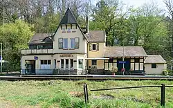 - Die Lahntalbahn führt am Ort vorbei und hat einen Bahnhof an der Strecke. Hier gibt es einen der letzten mechanisch beschrankten Bahnübergänge in Hessen.[9] Für ihre Reportage Zug um Zug – Das tägliche Chaos im Bahnverkehr (Dezember 2019) besichtigte ARD-Reporterin Jessica Sander den Bahnübergang.[10]