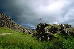 Der Anlass für Grímurs Suche war die Absicht, die bisherigen Kleinstaaten zu einem Gesamtstaat zu vereinigen und eine gemeinsame Volksversammlung einzurichten. Zuvor hatte es in den voneinander unabhängigen Gemeinden oft Schwierigkeiten und Unstimmigkeiten gegeben. Um die Streitigkeiten gerecht zu lösen, hatten vornehme Männer beschlossen, auch auf Island Thinge einzuführen und dort Volksversammlungen abzuhalten, wie sie bei den alten Norwegern und Germanen üblich waren. Die ersten Thingstätten entstanden auf Veranlassung von Þórólfr Mostrarskegg auf Snæfellsnes. Um 900 wurde von Þorsteinn, einem Sohn von Ingólfur Arnarson, eine weitere auf Kjalarnes eingerichtet. Der nach Südisland eingewanderte Úlfljótur reiste nach Norwegen, um ein neues Landesgesetz nach norwegischem Vorbild auszuarbeiten.[1] Während dieser in Norwegen weilte, suchte Grímur in dem unwegsamen Land nach einem passenden Ort.[2] Er entschied sich nach langer Suche für ein langes mit Gras und Buschwerk bewachsenes Lavafeld in der Almannagjá („Allmännerschlucht“) nordwestlich des Sees Þingvallavatn, um erstmals im Frühjahr des Jahres 930 die Oberhäupter der 13 Familien, die sogenannten Goden, zu versammeln. Ziel der Versammlung war es, das gemeinsame Leben zu ordnen.