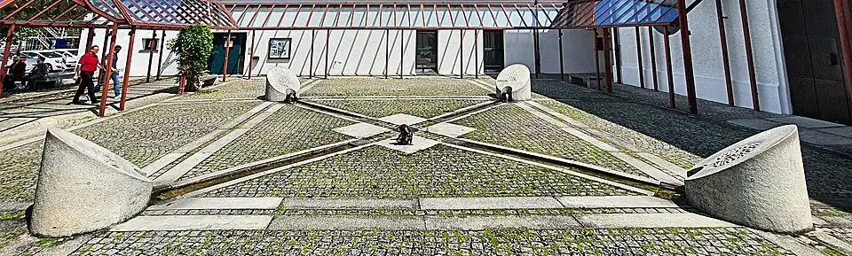 - Seit 1993 erinnert vor dem Postamt eine aus Eisen geschmiedete Skulptur an 260 Häftlinge, die während des Zweiten Weltkrieges hier Zwangsarbeit verrichten mussten, sowie an die hier eingesetzten 80 italienischen Militärinternierten.[17] Alljährlich wird am 27. Januar, dem Gedenktag für die Opfer des Nationalsozialismus, vor der Skulptur ein Kranz niedergelegt.