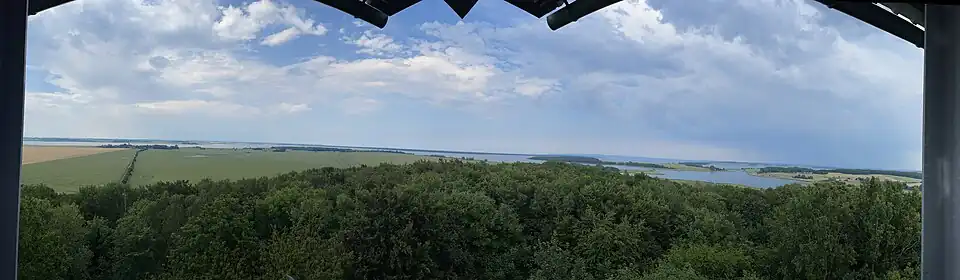 Der Turm ermöglicht bei guter Sicht einen Blick von Kap Arkona über die Halbinsel Jasmund, den Großen Jasmunder Bodden, die Stadt Bergen auf Rügen, Südrügen bis Stralsund sowie Hiddensee, Wittow und Liddow. Am Fuße des Turms befindet sich ein kleiner Parkplatz. Eine Anbindung an den ÖPNV besteht nicht; der Turm ist nicht barrierefrei. Am Aufstieg informiert ein Walderlebnispfad über die Tierwelt der Region.