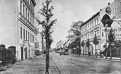 | Grünauer Straße im Jahr 1910 mit eingleisiger elektrischer Straßenbahn (rechte Straßenseite) | |