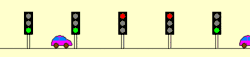 Die „Ausbreitung“ der Welle verfolgt man am besten, indem man die zeitliche Abfolge der Begegnungen eines Fahrzeuges mit den einzelnen Ampeln verfolgt. Es „reitet“ auf der Welle, indem es jede Ampel bei Grün trifft, sich also längs der Straße mit der gleichen Geschwindigkeit wie die Welle bewegt. Die nachstehende Bildsequenz zeigt den Zustand der Straße in zeitlichen Abständen T/4.
