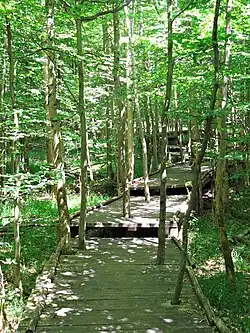 Der Weg führt vorbei an einem Aussichtsturm aus Fachwerk, einem Barfußpfad, Hängematten aus Holzlatten im Wald („Himmelsfenster“), einem „Waldxylophon“ aus hängenden Aststücken, einer Tier-Beobachtungsstation, einem sehr seltenen[19] Hainbuchenwald („Zauberhaftes Waldstück“) und einem Balancier-Parcours. Am östlichsten und höchsten Punkt des Rundweges steht der 35 Meter hohe Aussichtsturm „Himmelsleiter“ (Koordinaten) aus Aluminium mit vier verschieden hohen Plattformen.[20] Die Aussicht geht über die Wetterau bis in den Taunus und über das Gießener Becken bis zum Dünsberg. Der Blick über die Baumwipfel des Laubacher Waldes inspirierte den Grafen zu Solms-Laubach zum Namen „Grünes Meer“ für den Park.