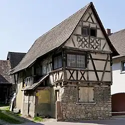Das zweigeschossige giebelständige Fachwerkhaus steht in der Jöhlinger Straße (Nr. 67). Das Erdgeschoss besteht aus massivem Bruchsteinmauerwerk, Obergeschoss und Dachgeschoss, beide auskragend, sind als Sichtfachwerk ausgeführt. Das als Wohnraum genutzte Obergeschoss ist nur durch eine längsseitige Außentreppe erreichbar. Im Untergeschoss befanden sich Werkstatt- bzw. Geschäftsräume. Mit einer Grundfläche von insgesamt nur 85 Quadratmetern ist das Gebäude verhältnismäßig klein. Dennoch wurde es bis in die 1980er Jahre als Wohngebäude genutzt und stand anschließend leer. Das äußere Erscheinungsbild des Gebäudes hat sich häufig verändert, so variierte die Fensteranordnung im Obergeschoss beispielsweise zwischen einem mittigen Zentralfenster und dem derzeit vorhandenen Eckfenster.