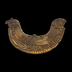 Die Grabkammer, in der sich zwei Bestattungen fanden, enthielt noch zahlreiche Beigaben, die den hohen Status der hier bestatteten Personen bezeugen. Bei einer von ihnen handelt es sich wahrscheinlich um einen König von Byblos. Zu den Beigaben gehört ein goldener Halskragen in ägyptischem Stil. Er ist aus Goldblech gearbeitet und zeigt an den Enden jeweils den Kopf eines Horusfalken. Mittig ist ein ganzer Horusfalke wiedergegeben.[2] Das Objekt befindet sich heute im Louvre in Paris. Daneben gab es Goldperlen, ein Krummschwert aus Bronze mit Goldeinlagen, eine große Hes-Vase aus Fayence und weitere Keramik sowie Steingefäße.