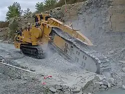 Grabenfräsen verfügen über eine vertikal schwenkbare Fräseinrichtung, die entweder mit einer Fräskette oder einem Fräsrad mit Rundschaftmeißeln ausgestattet ist.[3]