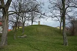 Bis 1918 war der Hügel von einem Kastanienbaum bekrönt, der gefällt wurde, um ein Denkmal für die Gefallenen des Ersten Weltkriegs zu errichten. Ursprünglich stand auf dem Hügel ein Menhir, den Niklasson noch liegend neben dem Hügel vorfand und der später zerstört wurde.