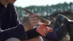 Danach wird der Befund geschnitten, um ein Profil zu erhalten. Zunächst wird eine Profilschnur über den Befund gespannt, die ihn in zwei Hälften teilt. Die eine Hälfte wird nun mit der Kelle bis auf eine neue Schicht abgetragen. Ist die neue Schicht eine eingelassene Schicht, wird ein Zwischenplanum gezeichnet, die Schicht erneut nivelliert und dann bis auf die darunterliegende abgetragen. Entlang der Profilschnur wird das Profil lotrecht abgestochen und fotografiert. Bevor nun das Profil im Maßstab 1:10[36] gezeichnet wird, muss die Profilschnur gespannt und waagerecht nivelliert werden. So kann später auf der Zeichnung der Verlauf des Profils genau dargestellt werden.