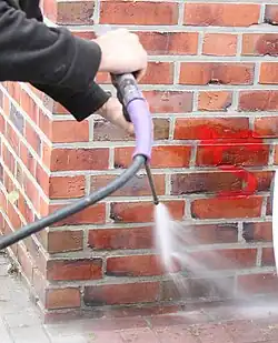 Beim Reverse Graffiti werden schmutzige Oberflächen, insbesondere mit Flechten besiedelte Betonmauern oder Asphaltboden, zum Beispiel mit Wasser, Seife und Bürste und Hochdruckreiniger selektiv so gesäubert, dass der gesäuberte Bereich das Graffito darstellt.[16] Es werden teilweise Schablonen verwendet. Diese Form von Graffiti wird sowohl von Writern und Streetartists, als auch Normalbürgern, Veranstaltern, Unternehmern und der Industrie genutzt[17][18], da durch diese Form von Graffiti Gesetzeslagen umgangen werden können.