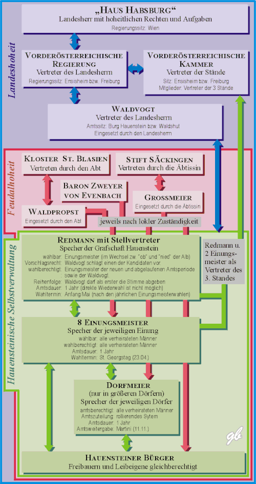 Die politische Struktur der Grafschaft Hauenstein hatte zur Zeit der Habsburger Herrscher, abgesehen von Zeiten der Verpfändung, drei Teile. Den hoheitlichen Teil, der vom Haus Habsburg wahrgenommen wurde, den feudalherrschaftlichen Teil, der sich auf verschiedene Feudalherren aufteilte und den selbstverwalteten Teil, der von den Bewohnern der Grafschaft in einer frühen demokratischen Struktur gestaltet wurde.