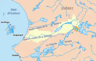 ![]() Einzugsgebiet des Grande rivière de la Baleine in gelb; dunkelgelb der Teil des Einzugsgebiets, welches nun zum La Grande Rivière entwässert wird | ||