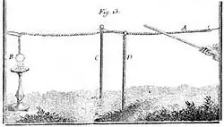 Zum Beweis, dass auch menschliche Körper Elektrizität leiten, ersetzen sie am 8. April 1730 die Hanfschnüre durch einen Schuljungen, den sie horizontal an Roßhaarschlingen aufhängten. Unter dessen ausgestreckten Arm wurde ein Visitenkartenständer mit Stanniolblättchen gestellt. Als ihm eine aufgeladene Glasröhre an die Fußsohlen gehalten wurde, flogen ihm die Stanniolblättchen in die Hand.[4][5]