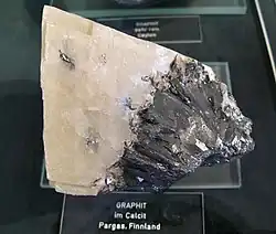 Graphit kommt daher bevorzugt in metamorphen Gesteinen vor, die in plattentektonischen Kollisionsgebieten während der Gebirgsbildung aus sedimentären Ausgangsgesteinen entstanden sind.[24] Durch Regionalmetamorphose gebildete Graphitvorkommen befinden sich linsen- oder nestartig abgetrennt im Umgebungsgestein, durch Kontaktmetamorphose gebildetes Graphit kann auch in Pegmatiten sowie in Kalk- und Sandsteinen vorkommen.[25] Weiterhin kann Graphit Bestandteil von Meteoriten sein.