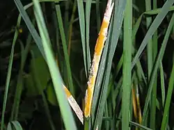 Auf den befallenen Gräsern bildet sich um den Halm herum ein weißliches, bis zu 5 cm langes Stroma, auf dem sich hellgelbe birnenförmige Perithecien mit kurzem Hals bilden: Diese sind dicht gedrängt (103 ±5 pro mm²). Dadurch erhält die Oberfläche ein körnig-raues Aussehen. Die Asci werden 163 × 6,9 µm groß und enthalten acht fädige Ascosporen. Diese sind 176 µm × 1,6 µm groß mit 6–9 Septen. Bei Reife werden sie als ganzes ausgestoßen.[1]