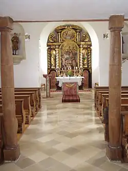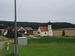 Hier wurde 1447 eine Kirche erbaut, die im Zuge der Säkularisation 1802 abgebrochen und 1820 wiederaufgebaut wurde. Sie ist eine Nebenkirche von Hagenhill. Der viersäulige Hochaltar mit dem Altarblatt, das die Heiligen Dionys, Sebastian und Jakob zeigt, stammt aus dem 17. Jahrhundert. Das Bild im oberen Auszug zeigt die hl. Dreifaltigkeit. Am Hochaltar stehen zwischen den Säulenpaaren die gotischen Holzfiguren des hl. Rusticus und des hl. Eleuterius und über der Tür des Vorzeichens im Westen der Kirche befindet sich eine Holzfigur des Kirchenpatrons – alle drei entstanden im 15. Jahrhundert. Die beiden Reliquienbüsten auf dem Hochaltar (Ende 15. Jahrhundert) stellen den hl. Sebastian und den hl. Erasmus dar. Der viergeschossige Turm (die unteren 2 Geschosse quadratisch, darüber 2 achteckige Geschosse) mit Haube steht im Südosten der Kirche.
