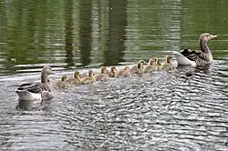 Meist bleiben die Jungtiere bis zur nächsten Brut mit den Elterntieren zusammen und sind auch später oft bei diesen anzutreffen. Graugänse erkennen einander hauptsächlich am Ruf. Auf großen Rastplätzen herrscht oft die ganze Nacht ein reges Rufen und Treiben, das dem Wiederfinden von Familienmitgliedern dient.