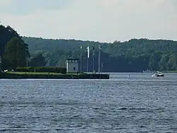 Das Gelände der GÜST umfasste eine Fläche von ca. 55 Hektar. An der schmalsten Stelle zwischen südlichem und nördlichem Ufer war eine Pontonsperre angebracht. Der für die Ein- und Ausreise vorgesehene Raum war jeweils durch eine Seilsperre mit Kettennetz von 25 m Breite gesichert.