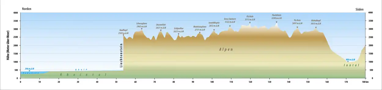 Diesem folgt die Grenze bis zum Feldkircher Ortsteil Bangs im Südwesten Vorarlbergs, wo die gemeinsame Grenze Österreichs mit der Schweiz durch das Staatsgebiet des Fürstentums Liechtenstein unterbrochen wird. Dieser Dreiländergrenzpunkt stellt gleichzeitig den westlichsten Grenzpunkt Österreichs und den nördlichsten des Fürstentums Liechtenstein dar. Liechtenstein bildet einen Monolithen zwischen Österreich und der Schweiz, wodurch die Staatsgrenze der beiden Staaten erst wieder am Gipfel des Naafkopfs im Rätikon auf 2571 Meter über Adria (bzw. 2570 Meter über Meer nach schweizerischer Messung) aufeinander treffen. Ab diesem Punkt grenzt auf Schweizer Seite nicht mehr der Kanton St. Gallen, sondern der Kanton Graubünden an Österreich. In der Folge erstreckt sich die Staatsgrenze über den Gebirgskamm des Rätikons und findet ihren Anschluss im Hauptkamm der Silvrettakette, wobei unter anderem der Piz Buin, mit 3312 m ü.A. der höchste Berg Vorarlbergs, einen der Grenzpunkte bildet. Die Überquerung der beiden Gipfel der Dreiländerspitze markiert die innerstaatliche Grenze zwischen den österreichischen Bundesländern Vorarlberg und Tirol. Mit dem 3399 m ü.A. (bzw. 3398 m ü. M.) hohen Fluchthorn überquert die gemeinsame Grenze in der Folge auch den zweithöchsten Gipfel der Silvretta und erreicht dabei den höchsten Punkt der gemeinsamen Staatsgrenze. Danach überquert sie auch einige Gipfel der Samnaungruppe. Zwischen Schalkl, einem Ortsteil der österreichischen Gemeinde Pfunds, und Martina, einem Ortsteil der Schweizer Gemeinde Valsot, verläuft die Staatsgrenze bis Finstermünz zunächst am westlichen Ufer unmittelbar neben der alten Strasse[6][7] und springt unmittelbar südlich der Brücke von Finstermünz in die Flussmitte des Inn. Im Anschluss daran führt die Staatsgrenze zwischen Tirol und Graubünden auch wenige hundert Meter durch die Sesvennagruppe und erreicht kurz vor dem Gipfel des Piz Lad im Dreiländereck mit Italien ihr Ende.