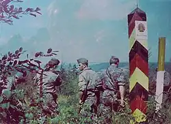 Die Grenztruppen der DDR waren eine dem Ministerium für Nationale Verteidigung (MfNV) unterstehende, eigenständige militärische Formation der Bewaffneten Organe der DDR zur Sicherung der territorialen Integrität und Überwachung an der land- und seeseitigen Staatsgrenze der DDR.[7][8]