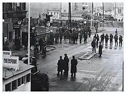 Berlin: Blick am Checkpoint Charlie auf Absperrkette und Sperrenbau (4. Dezember 1961)