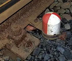 In der Schweiz wird das Grenzzeichen als Sicherheitszeichen bezeichnet. Es ist wie in Deutschland als Pflock mit Haube aufgebaut, allerdings in rot und nicht rot-weiß gestreift.[5] Wenn das Grenzzeichen auf dem Boden aufgemalt wird, ist es ein längliches Rechteck, das je zwei weiße und rote diagonal angeordnete Flächen besitzt. Die gelbe Version kennzeichnet den Anfang oder das Ende einer Gleisfreimeldeeinrichtung.[6]