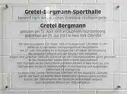 - ↑ Karlsruher Tagblatt vom 3. Juni 1935, Seite 6: „Eine sehr gute Leistung vollbrachte auch die Hochspringerin Frl. Bergmann (Stuttgart). Sie übersprang bei schlechten Bodenverhältnissen glatt 1,55 Meter.“