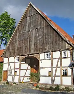 Kern der Hofanlage ist das Niederdeutsche Hallenhaus, das als Wohn-Wirtschaftsgebäude in Vierständerbauweise dreifach verriegelt, mit Fußstreben gesichert und zudem mit einem Vorschauer versehen, 1742 errichtet worden ist. Ende des 19. Jahrhunderts reichte der Wirtschaftsteil nicht mehr aus, so dass an das östliche und westliche Seitenschiff Ställe, teils in Backstein, teils in Fachwerk errichtet, angebaut wurden. Östlich gegenüber dem Wohnteil steht ein Fachwerkspeicher aus dem Anfang des 19. Jahrhunderts, der ehemals als Backhaus genutzt wurde. Um 1914 wurde dann noch eine großräumige Scheune errichtet, die eine ältere ersetzte. Die Anbauten sind so angeordnet, dass eine eindrucksvolle u-förmige Anlage entstanden ist. Diese ist als Zeugin des landwirtschaftlichen Wandels von der vor- zur industriellen Epoche als Baudenkmal geschützt.