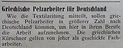 Der Pelzhandel erlitt ab den frühen 1980er Jahren einen rapiden Niedergang. Für zahlreiche Griechen und griechischstämmige Deutsche, die teilweise seit Generationen in diesem Bereich arbeiteten, bedeutete dies den Verlust der beruflichen Existenz. Kürschner und Pelzhändler wandten sich anderen Berufen zu, häufig der Gastronomie, in der bereits zahlreiche Griechen arbeiteten. Bis heute sind mit 15,5 % ein relativ hoher Anteil von Griechen in Deutschland beruflich selbstständig, davon wiederum ist der Frauenanteil mit 24,0 % verhältnismäßig groß.[31]