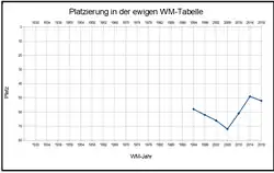 | 10 WM-Spiele 2 Siege 2[1] Unentschieden 6 Niederlagen 5:20 Tore | |