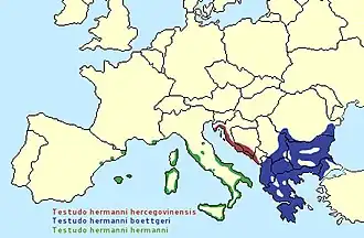 - ↑ a b c U. Fritz, M. Auer, A. Bertolero, A. Heylan, T. Fattizzo, A. K. Hundsdorfer, M. M. Sampayo, J. L. Pretus, P. Siroky, M. Wink: A rangewide phylogeography of Hermann's tortoise, Testudo hermanni (Reptilia: Testudines: Testudinidae): implications for taxonomy. (PDF-Datei; 1,77 MB) In: Zoologica scripta. 35, Nr. 5, 2006 (doi:10.1111/j.1463-6409.2006.00242.x), S. 531–543.