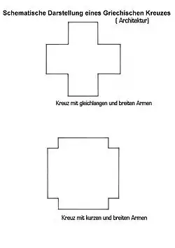 In der Architektur spielt das griechische Kreuz als Grundriss eine bedeutende Rolle, es symbolisiert den christlichen Glauben. Es ist eines der ältesten christlichen Symbole und die Balken bedeuten Erde und Himmel oder Raum und Zeit. Die ersten Bauten waren byzantinische und syrische Kirchen, in Europa entstanden auf dem Grundriss des griechischen Kreuzes große Bauwerke, meist als Zentralbauten. Als Zentralbau konzipierte Kirchen vor allem des christlichen Ostens haben oft den Grundriss eines griechischen Kreuzes, in der Renaissance wird das Motiv ebenfalls aufgegriffen, etwa durch Palladio bei seiner Villa La Rotonda.