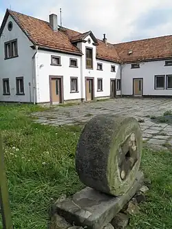 Letzter Mühl- bzw. Schleifstein aus Grillenburger Sandstein vor der ehemaligen Steinbruchverwaltung an der Seerenteichstraße in Grillenburg
