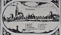 - Martin Zeiller: Grimmen. In: Matthäus Merian (Hrsg.): Topographia Electoratus Brandenburgici et Ducatus Pomeraniae (= Topographia Germaniae. Band 13). 1. Auflage. Matthaeus Merians Erben, Frankfurt am Main 1652, S. 61 f. (Volltext [Wikisource]).