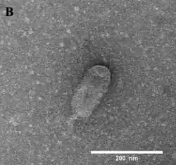 Der Salmonella-Phage 7-11 (Salmonella Newport phage 7-11) wurde von der iranischen Biologin und Pionierin der Biokraftstofftechnologie Prof. Nasrin Moazami (geb. 1945)[6] et al. gründlich charakterisiert.[7] Es handelt sich um einen Virus vom Morphotyp der Podoviren, Subtyp C3, mit einem länglichen Kopf von 154 × 40 nm und einem Schwanz von 12 × 9 nm.[4]